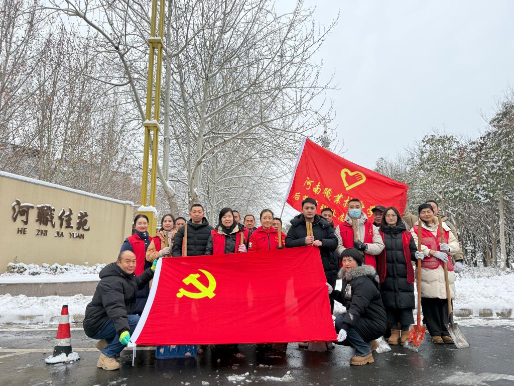 1月19日降雪后,河职佳苑居民在感受雪景惊喜的同时,也面临出行不便问题。为保障道路畅通、消除安全隐患,1月20日上午,后勤管理处党支部与文苑路社区党支部联合开展“除冰铲雪保安全”行动。