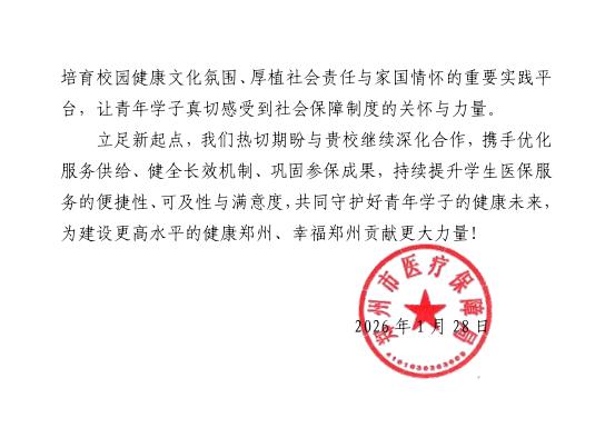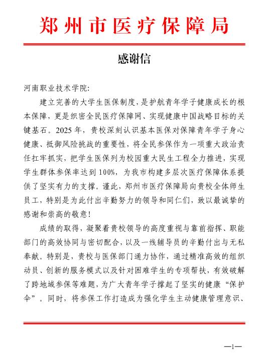近日,郑州市医疗保障局向我校发来感谢信,高度赞扬我校在2025年度大学生基本医疗保险参保工作中取得的突出成绩,并对校领导、职能部门及一线辅导员的辛勤付出致以诚挚感谢。